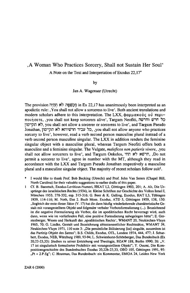 ‚A Woman Who Practices Sorcery, Shall not Sustain Her Soul‘: A Note on the Text and Interpretation of Exodus 22,17