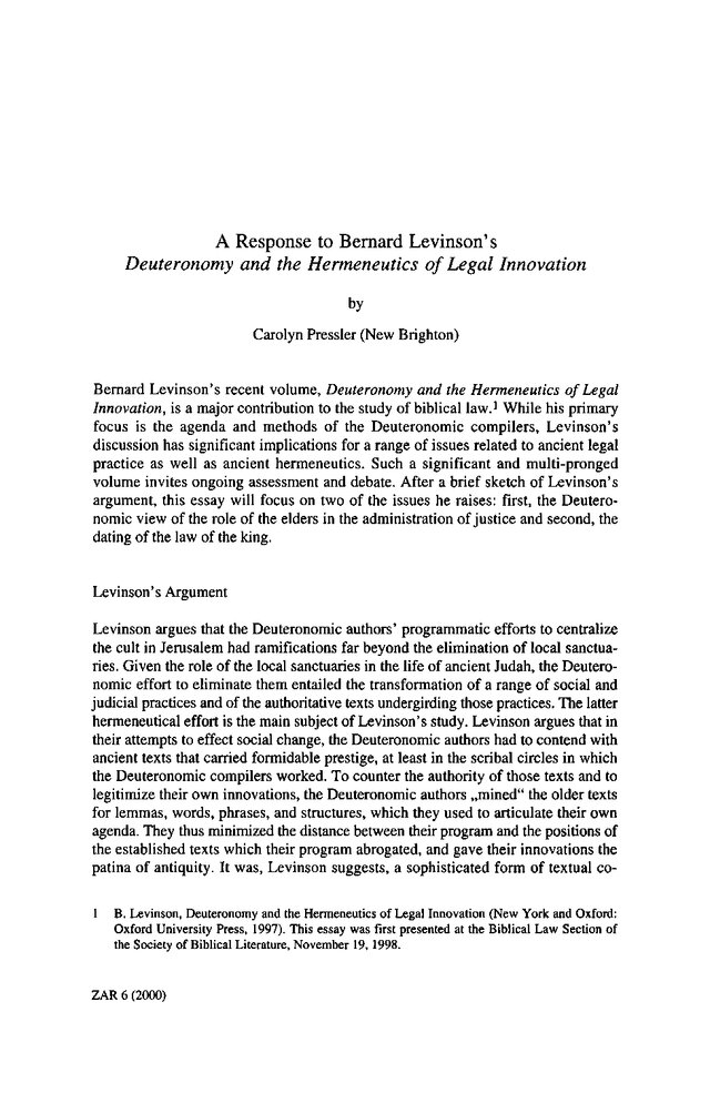 A Response to Bernard Levinson's "Deuteronomy and the Hermeneutics of Legal Innovation"
