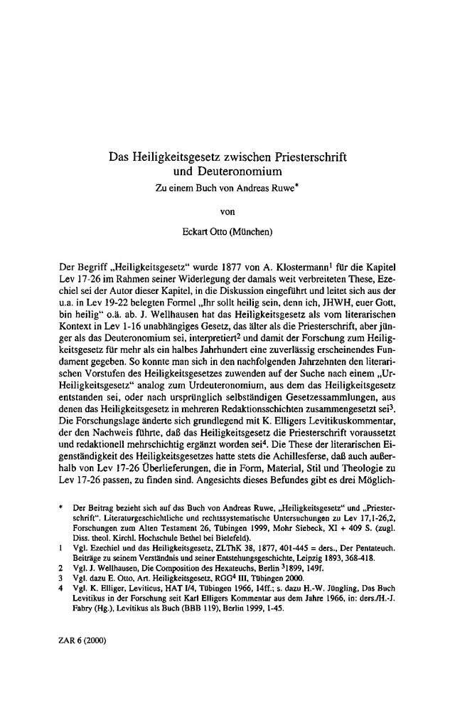 Das Heiligkeitsgesetz zwischen Priesterschrift und Deuteronomium: Zu einem Buch von Andreas Ruwe
