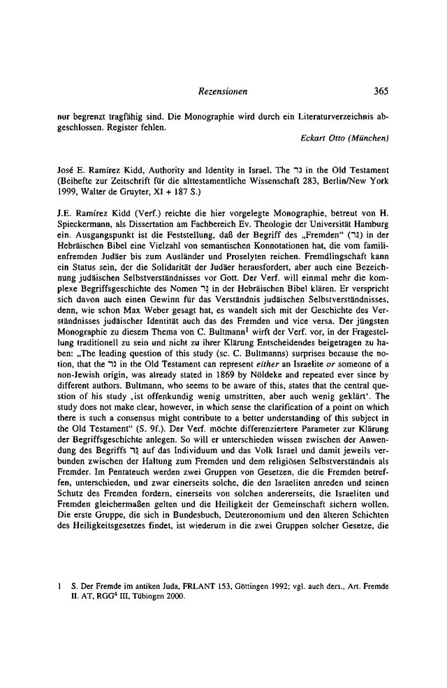 Authority and Identity in Israel. The גר in the Old Testament (Beihefte zur Zeitschrift für die alttestamentliche Wissenschaft 283) José E. Ramírez Kidd