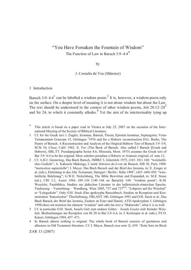 3 Cf. in particular O.H. Steck, Israels Gott statt anderer Götter – Israels Gesetz statt fremder Weisheit. Beobachtungen zur Rezeption von Hi 28 in Bar 3,9–4,4, in: I. Kottsieper et al. (eds.), FS O. Kaiser, Göttingen 1994, 457–471.