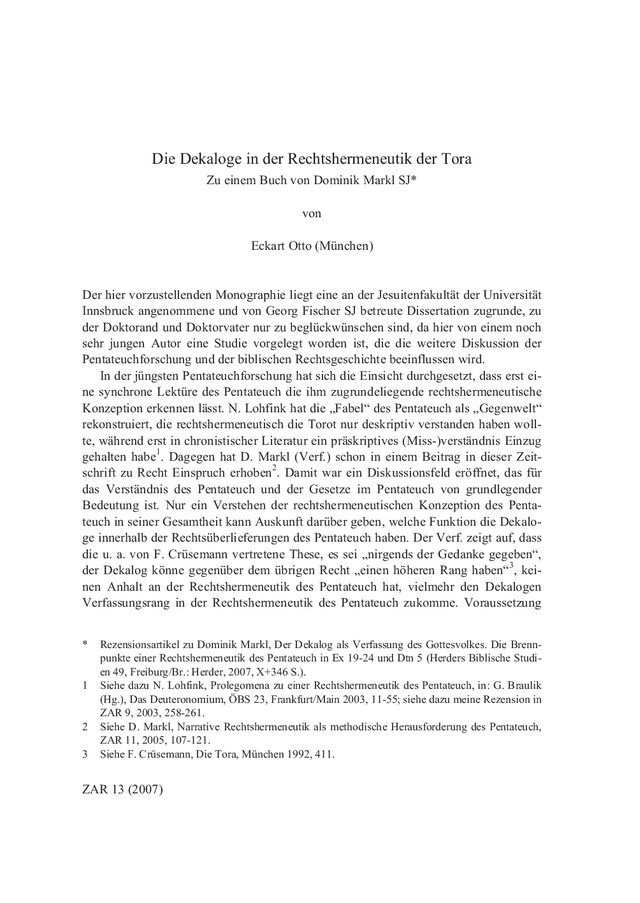 1 Siehe dazu N. Lohfink, Prolegomena zu einer Rechtshermeneutik des Pentateuch, in: G. Braulik (Hg.), Das Deuteronomium, ÖBS 23, Frankfurt/Main 2003, 11–55; Siehe dazu meine Rezension in ZAR 9, 2003, 258–261.