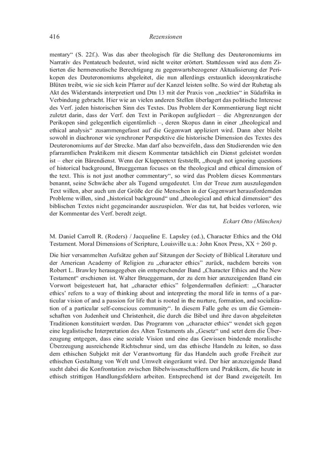 M. Daniel Carroll R. (Roders) / Jacqueline E. Lapsley (ed.), Character Ethics and the Old Testament. Moral Dimensions of Scripture, Louisville u.a.: John Knox Press, XX + 260 p.