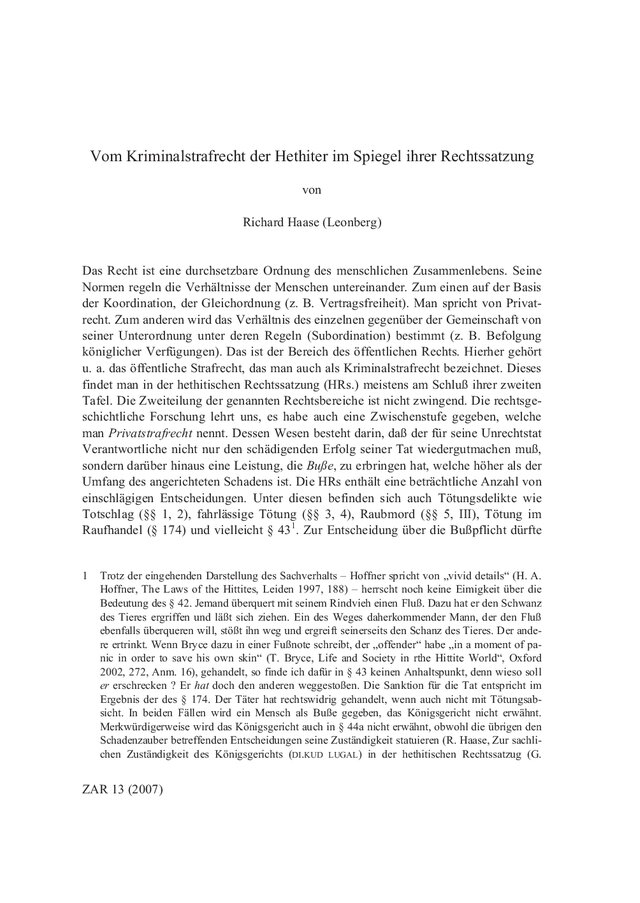 3 R. Haase, Über Ritus und Magie in der hethitischen Rechtssatzung, ZAR 10, 2004, 278–280.