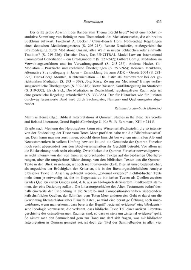 Matthias Henze (Hg.), Biblical Interpretations at Qumran, Studies in the Dead Sea Scrolls and Related Literature, Grand Rapids/Cambridge U. K.: W. B. Eerdmans, XIII + 214 S.