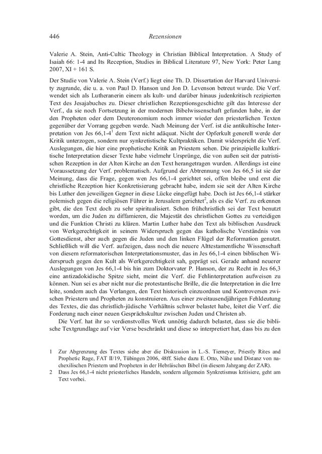 Valerie A. Stein, Anti-Cultic Theology in Christian Biblical Interpretation. A Study of Isaiah 66: 1-4 and Its Reception, Studies in Biblical Literature 97, New York: Peter Lang 2007, XI + 161 S.