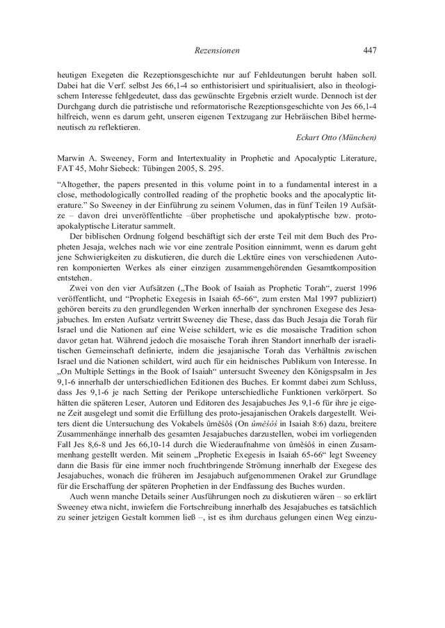 Marwin A. Sweeney, Form and Intertextuality in Prophetic and Apocalyptic Literature, FAT 45, Mohr Siebeck: Tübingen 2005, S. 295.