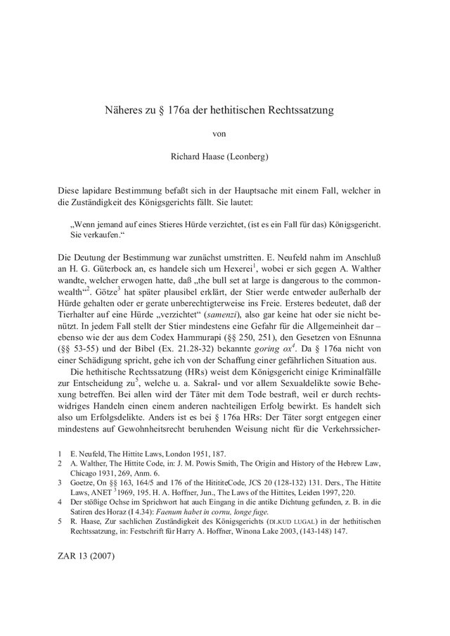 5 R. Haase, Zur sachlichen Zuständigkeit des Königsgerichts (DI.KUD LUGAL) in der hethitischen Rechtssatzung, in: Festschrift für Harry A. Hoffner, Winona Lake 2003, (143–148) 147.