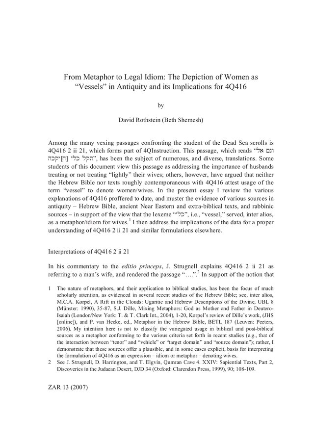 1 The nature of metaphors, and their application to biblical studies, has been the focus of much scholarly attention, as evidenced in several recent studies of the Hebrew Bible; see, inter alios, M.C.A. Korpel, A Rift in the Clouds: Ugaritic and Hebrew Descriptions of the Divine, UBL 8 (Münster: 1990), 35–87, S.J. Dille, Mixing Metaphors: God as Mother and Father in Deutero-Isaiah (London/New York: T. & T. Clark Int., 2004), 1–20, Korpel's review of Dille's work, (JHS [online]), and P. van Hecke, ed., Metaphor in the Hebrew Bible, BETL 187 (Leuven: Peeters, 2006). My intention here is not to classify the variegated usage in biblical and post-biblical sources as a metaphor conforming to the various criteria set forth in recent studies (e.g., that of the interaction between „tenor“ and „vehicle“ or „target domain“ and „source domain“); rather, I demonstrate that these sources offer a plausible, and in some cases explicit, basis for interpreting the formulation of 4Q416 as an expression - idiom or metaphor - denoting wives.